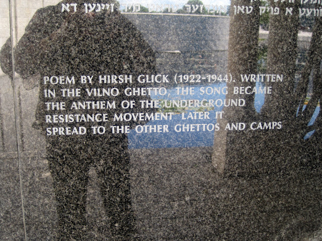 photographs the history of the holocaust from 1939 to 1945. At the end of the wall is engraved a poem and a hymn from the ghetto.