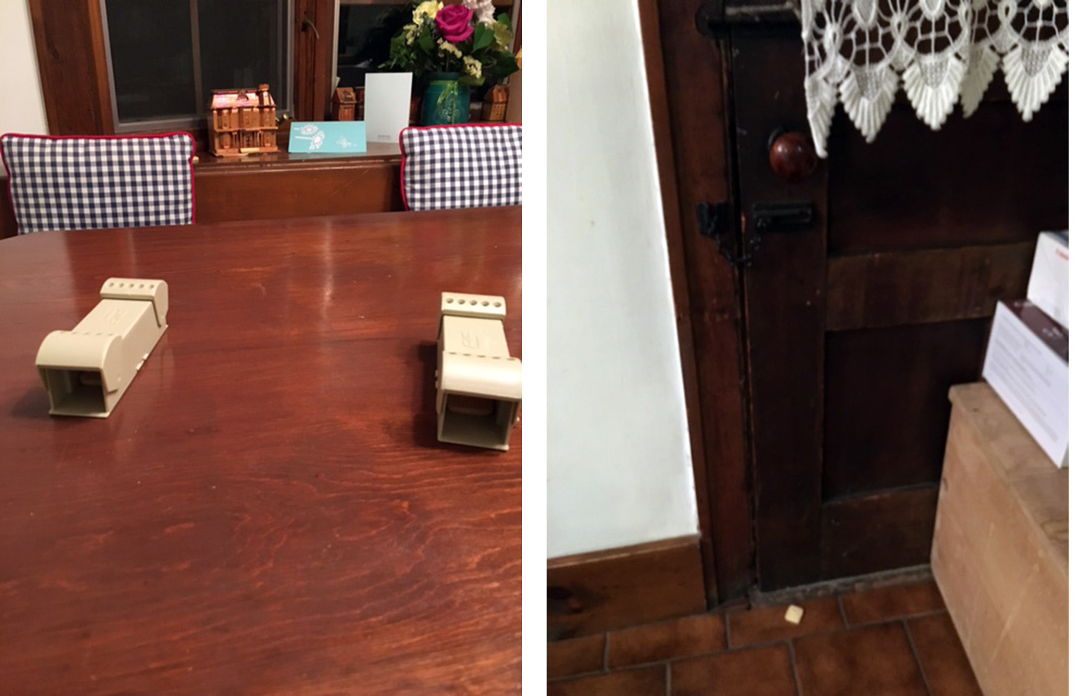 It was time to bring in the big guns.  We put cookie pieces in two "humane traps" and a piece on one trap that has sticky guck so that when a mouse steps in it, he's stuck there.  The box-like traps are left open at both ends, with some food in the center, and when a mouse walks in, both end doors slam shut and the animal is trapped inside, until you carry it far away and release the thing to the wilds.  In the morning, we saw that the thief in the night had managed to remove one cookie piece from the box trap without making the doors come down (he must have reached in without stepping on the floor of the trap) and he (or she!) had also removed the treat from the sticky guck without stepping on it and getting stuck.