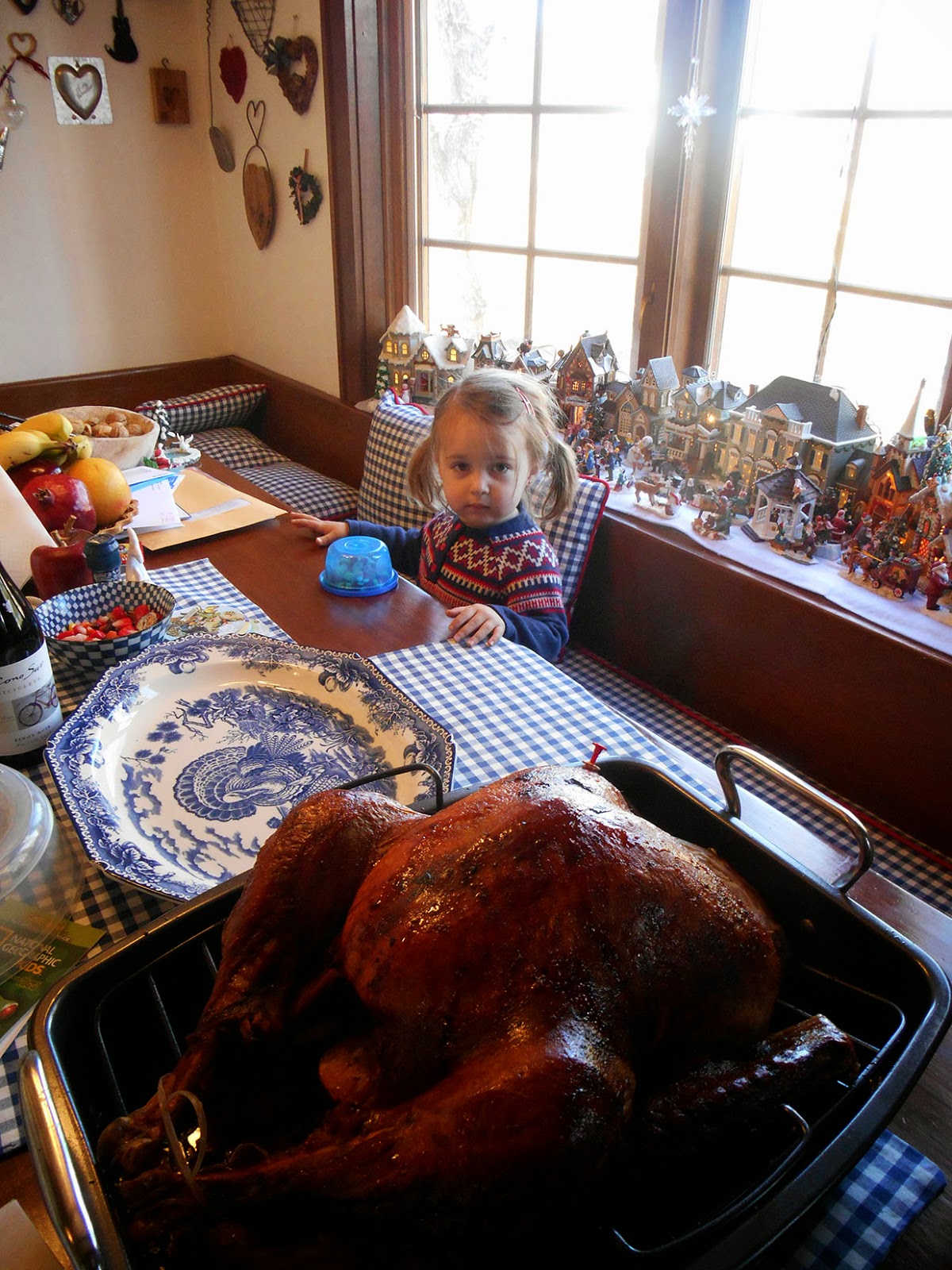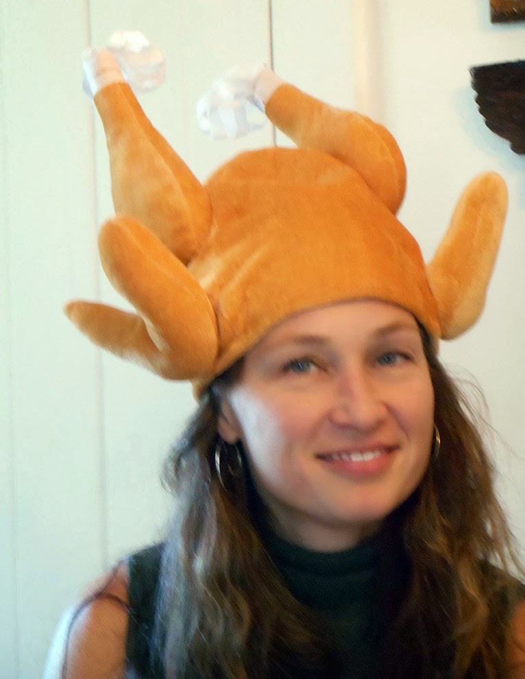 The paper crowns in the holiday poppers (known in England as "Christmas Crackers") have always been a tradition, but last year someone brought in a Turkey hat, which daughter Marina wore with grace and good humor.  You can bet that turkey hat will be back