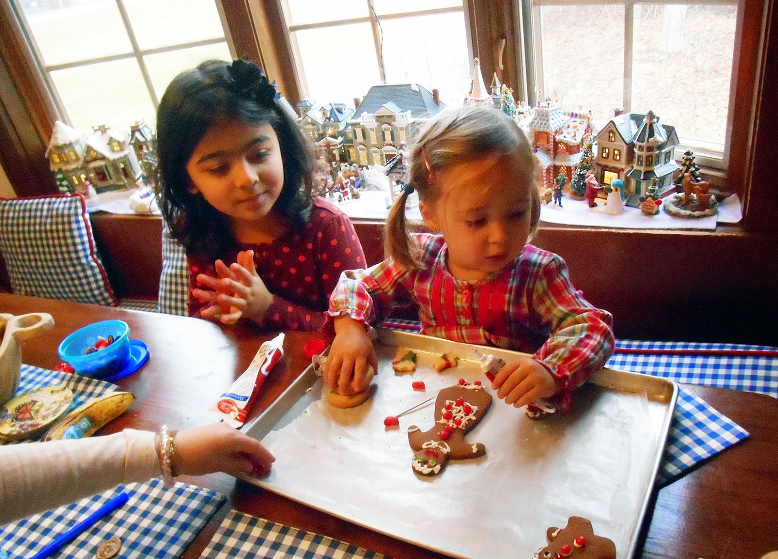 After dinner Natasha and Sofie and I decorated gingerbread men.  Natasha's proud of her design.  I'm still pondering  which  cutting edge fashion  statement my gingerbread man will make.