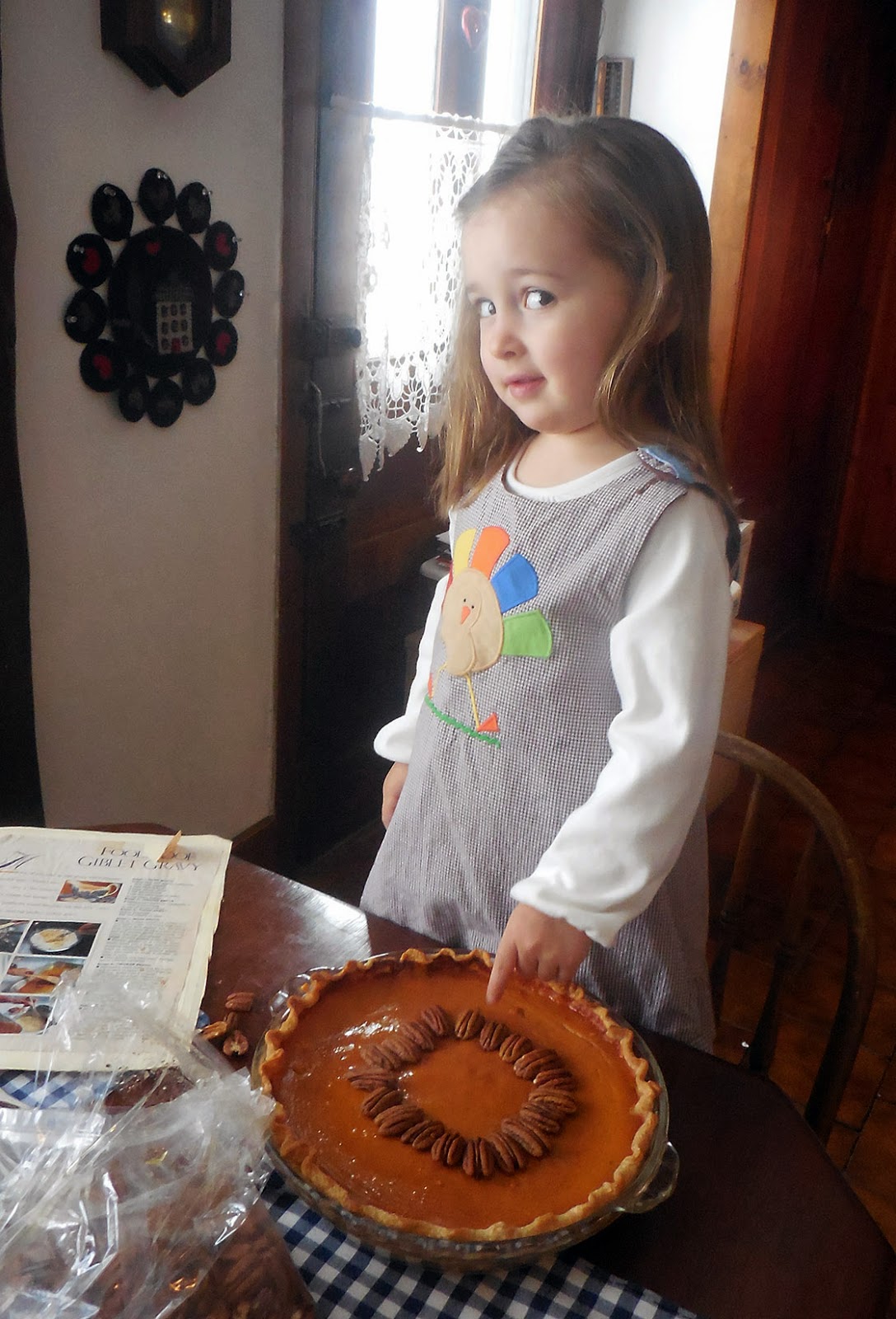 I helped Yiayia make two of the five pies for Thanksgiving dinner.  I decorated the pumpkin pie with pecans, which made all the difference.  Then Yiayia poured a little caramel sauce on the pecans.